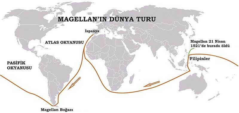 Macellan son yolculuğunu tamamlayamadan Filipinler’deki Mactan Savaşı’nda öldürüldü. Ancak daha önce ziyaret ettiği Baharat Adaları’nın ötesine giderek tüm meridyenlerden geçen ilk insanlardan olmayı başardı. Büyük Okyanus’a seferi esnasında okyanusu çok sakin gördüğü için “pasifik” (sakin) ismini veren, ayrıca Güney Amerika’da keşfettiği boğaza kendi ismi verilen Portekizli denizci Macellan, Büyük Okyanus’u aşan bir araştırma gezisi yapmış ilk insandır.